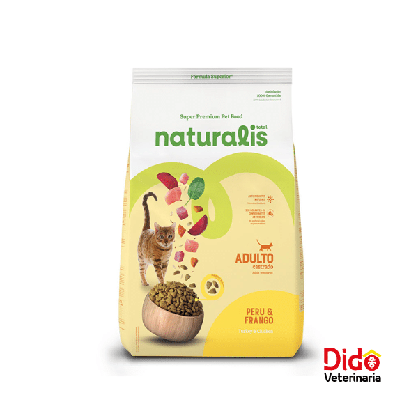 Naturalis – Adulto Castrado Frango & Perú, esta compuesta de planta de maíz entero, harina de soja, harina de ave de pollo, arroz (8%), sorgo entero (5%), avena entera (5%), harina de pavo (5%), carne separada mecánicamente de pollo (3%), trigo (3%), grasa de pollo, linaza (1,2%), fosfato dicálcico, frutos secos (papaya y manzana) (2%), antioxidantes naturales (tocoferol y esencia de romero ), aceite de romero (0,01%), sulfato de aceite de aguacate (0,01%), color de caramelo natural, vitamina A, vitamina B12, vitamina D, vitamina E, selenito de sodio, ácido fólico, ácido pantoténico, de cobre, cloruro de colina, sulfato ferroso, yodato de calcio, óxido de manganeso, vitamina B1, vitamina B2, vitamina B6, vitamina H, vitamina K, vitamina PP, óxido de zinc. Proteína Cruda (Mín.) 23.0%, Extracto Etéreo (Mín) 10.0%, Fibra Cruda (Máx.) 4.0%, Minerales (Máx.) 10.0%, Calcio (Mín/Máx.) 0.9% / 2.2%, Fósforo (Min) 0.8%.