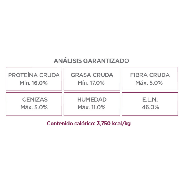 Arroz, maíz, harina de carne de pollo, grasa de pollo, harina de huevo, pulpa de remolacha, harina