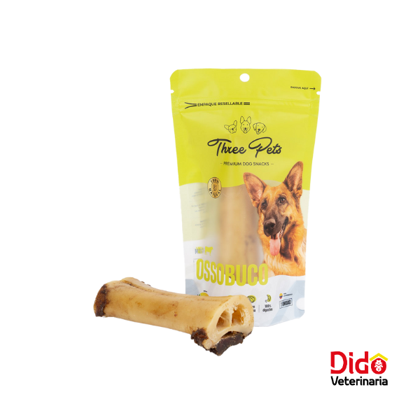 THREE PETS DOG OSSOBUCO Hechos de un único ingrediente y por su alto contenido en proteína, fibra, grasa natural, son ideales para complementar la alimentación diaria de nuestros peludos, además entretienen y relajan a tu mascota. Todos nuestros snacks son elaborados de un único ingrediente a base de subproducto cárnico de la res y el cerdo, los cuales son sometidos a un proceso de deshidratación al horno, reduciendo al mínimo los niveles de humedad y garantizando que el producto se conserve sin necesidad de ningún conservante químico que pueda perjudicar la salud del peludito.